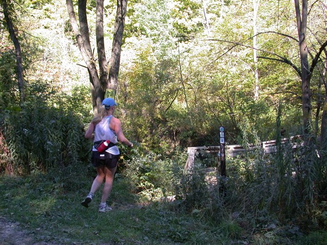 "It was still quite cool on top of Connecticut Hill for my 10:00AM start of stage 3 of my first triennial; perfect weather for a trail race. After watching Tim Ingall, Jeff Juran, and several others who have no need for a head start leave before me and the 3 other 10:00AM starters, I took off. As I left the start I noted that, though there were supposed to be 4 of us, there were only 3. Being one of the slower runners, I let the others get in front of me for the beginning of the race. After about 15 seconds I heard some shouting coming from the road behind me, and then almost immediately, the 4th 10 o'clock starter (Ian Webber) was on my heals. Ian and I ran together for a while, zipping past a BottomFeeder (Matt) on our way down the first hill (This is an event that is becoming common for me as I gain more trail racing experience; no words were exchanged, no request to pass was made, but as I came upon the runner ahead of me on the steep downhill trail, he stepped to the side. I guess I am loud going down hills). After a couple of miles Ian got tired of my plodding pace on a flat stretch and passed me like I was standing still."Having prerun my stage and studied the map thoroughly (the race is to prepare) I had stored away in my brain what I needed to do at each road crossing, as in my prerun of my stage this is where I had the most difficulty keeping track of the trail. This strategy did not pay off; as I came out onto Cayutaville road, I thought I was on Griffin road; I turned right immediately, rather than looking several yards to my left for the trail. Fortunately I realized that there were no blazes on the side of the road, and it looked unfamiliar rather quickly, and my little detour only cost me about 3 minutes. This was the only time I got off trail, though I did have to slow down at a few double blazes to see where the trail was later in the stage. Shortly after getting back on the trail and into the woods, I came across a wounded Josh Cross, I quickly determined that he was in need of a ride and that BottomFeeder Matt had gotten in front of me during my off trail excursion. I caught up to Matt on the long road section as Tessa was driving by looking for Josh. After giving Tessa directions to Josh, Matt and I ran together until we entered the woods again for the first loop off of Rumsey Hill road, where I slowly pulled away from him. I might not have been able to do this had June not cleared the spider webs for me :).