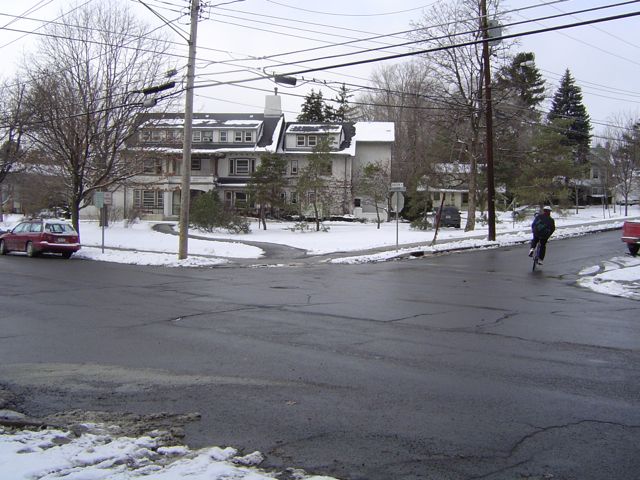 Start of loop, leaving Thurston Ave. (crossing in foreground) heading N (to the right) on Wyckoff Ave.