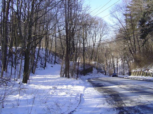 Grade leaving Thurston Ave. (continues downhill at right) at Barton Place (behind photographer), on N side of the Knoll. A passing track began here.