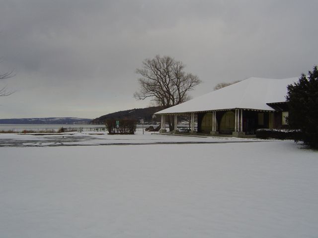 Main pavilion at Stewart Park; terminus of street railway in current parking lot. Lookng N up lake.